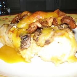 - Heat oil in a large skillet over medium heat. Place the breasts in the skillet and saute for 3 to 5 minutes per side, or until browned. Remove from skillet and place the breasts into a 9x13 inch baking dish. Apply the honey mustard sauce to each breast, then layer each breast with mushrooms and bacon. Sprinkle top with shredded cheese.